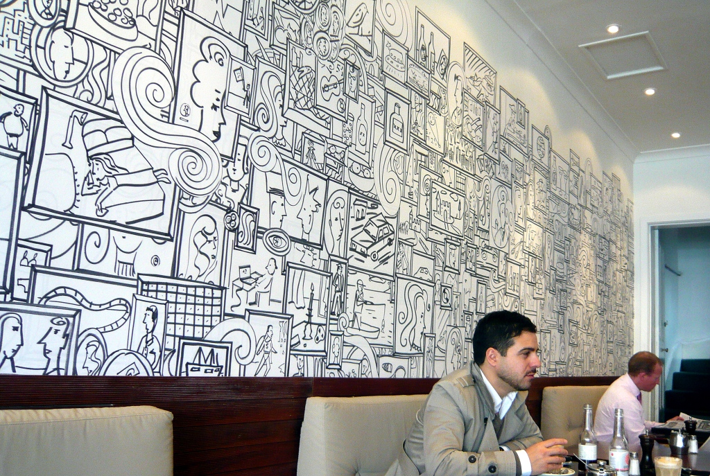 Here, taking time out from the business of life, one can enjoy the view of people coming and going alongside those fixed to the wall more permanently. Going soft in the heat of a sultry afternoon I feel a bit like the mad woman in The yellow wallpaper disappearing into the background. Familiar figures and faces pop up in a seemingly endless array of frames, all different but somehow the same, reduced to an all-over signifying, simplified line. These figures stand tall, full frontal or in side view, cut-off like a portrait, or semi-inclined, stretched out like an odalisque or participating in some kind of action. With their pointed gestures, striking poses, look and dress and all the right accoutrements, a life in pictures is played out before my eyes.