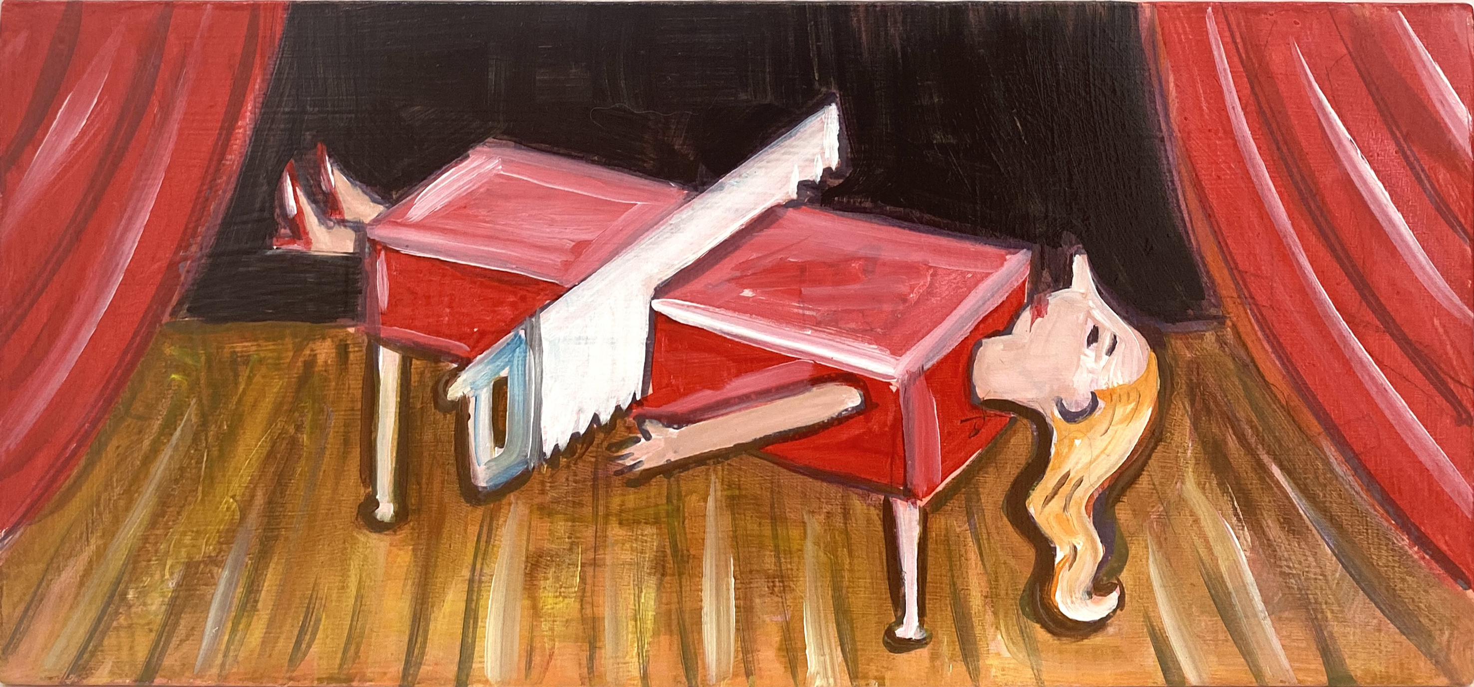 The Sawing in Half Trick, 2024, oil on board, 10 x 24 cm