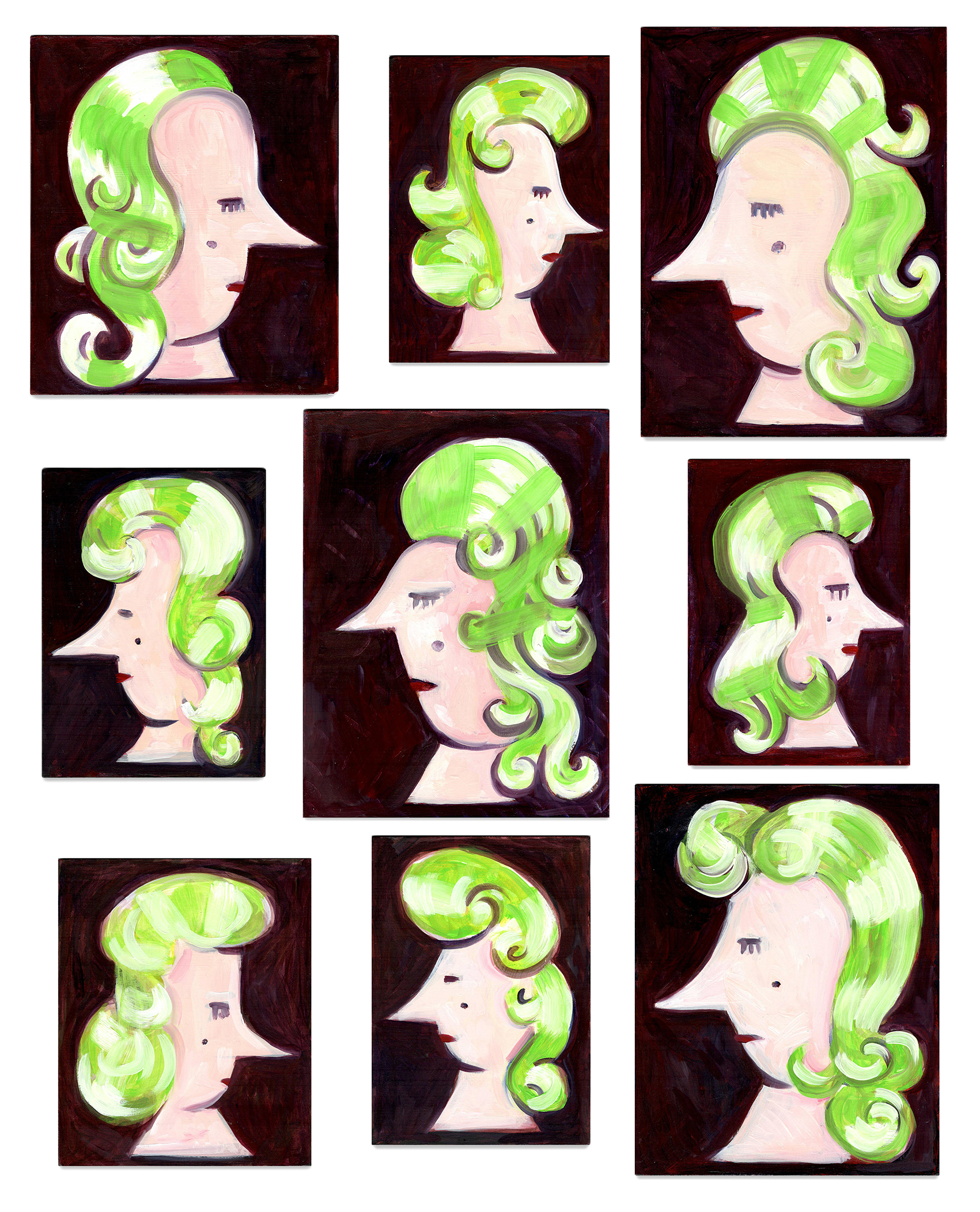 Portrait with Green Hair (9 Versions), 2024, 66 x 56 cm
