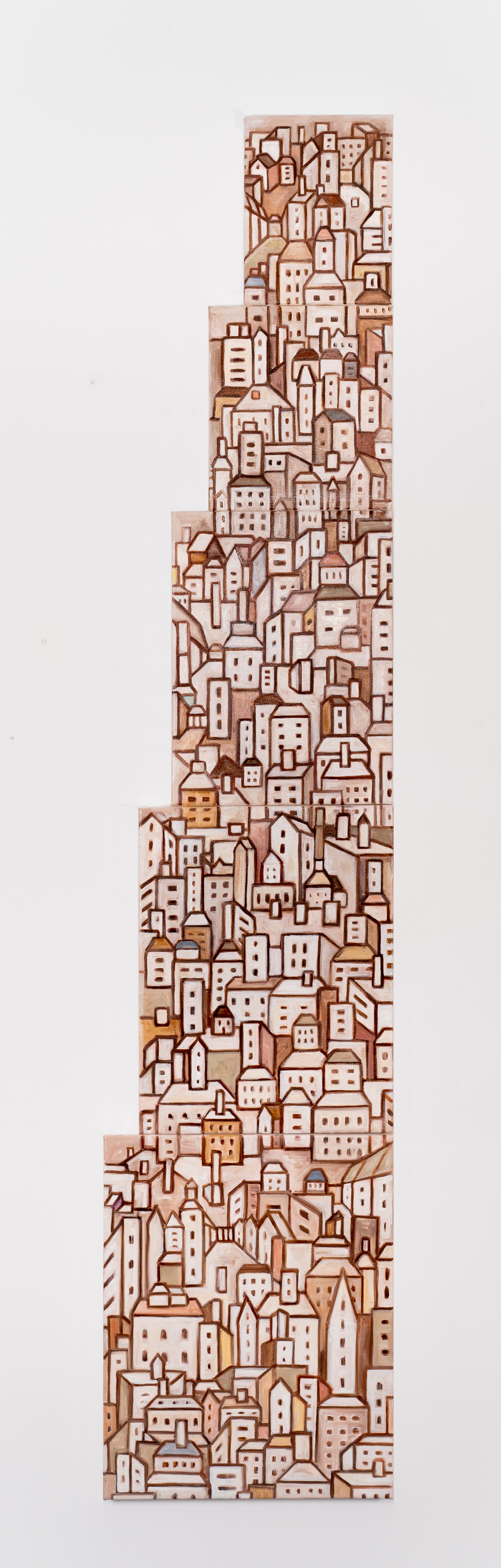 But then I see that some of the thick black sketch lines are a bit skew-wif, that some rectangles and triangles are wonky, and that some chimneys coil back into themselves… And then the windows become eyes and the smoke-stacks become limbs and all of a sudden I’ve caught these edifices like deer in headlights – these buildings have become humanoid and are staring back at me, some with an empty gaze, others with surprise - or shame. For these densely packed, absurd looking constructions reveal our obsession with building, with mass producing, with extending our anthropocene reach interminably. These cityscapes conjur a vision of the overworked and overstimulated brain and organs of today’s citydweller, endlessly consuming. At once cute and comic, they can morph into the ugly and dark. Are the fleshy coloured paintings on the stark black and white wallpaper a view of a harsh reality through rose coloured glasses?